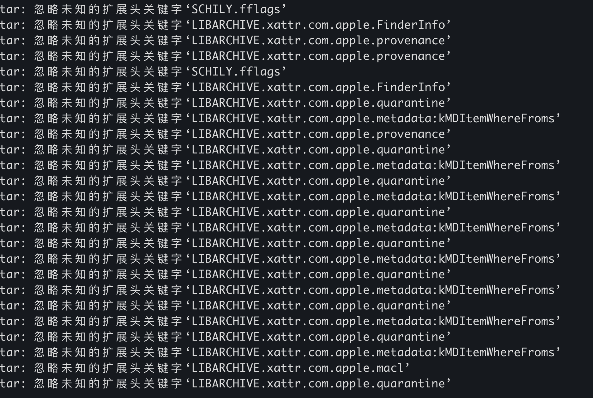 IT tar打包命令使用 1. tar解包到指定的地址-C 可以覆盖&融入之前已有的文件(夹) 1 tar -xvf abc.tar -C /usr/local/dist 2. 忽略解包的时候报错 tar解压时候,有时候会出出现以下报错 可以使用如下参数忽略报错 1 tar -xvf abc.tar --warning=no-unknown-keyword 3. tar打包指定文件夹 1 tar -cvf /tmp/web-static.gz -C /the/target/dir/ .